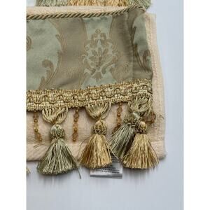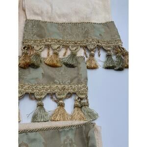Elegant set of two decorative hand towels by Croscill Home, ideal for guest baths or powder rooms. Features soft ivory cotton base with sage green and gold damask jacquard trim, accented by braided rope, tassels, and glass beads. Adds a refined touch to traditional or vintage-inspired spaces. Pre-owned and used for display only—excellent condition. Perfect for elevating bathroom decor with timeless luxury. Pair with matching accessories or use as a statement accent.