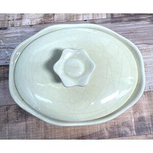 Crazing is present across the surface as part of its design. Some marks visible on the base. Height including lid = 6 inches.