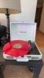 Crosley turntable featuring a pastel watercolor design. Chrome accents add a touch of elegance. Equipped with pitch and volume controls. Has two speakers to play directly on the turntable or you can link up to Bluetooth.