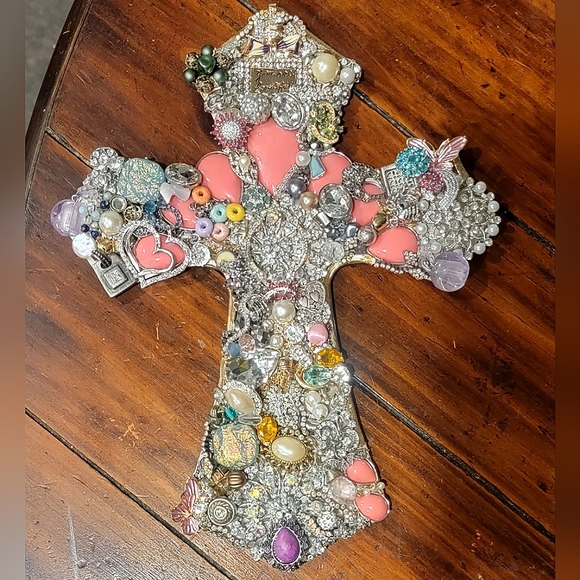 Gorgeous one of a kind vintage jewelry cross. With pinks, greens, silver, rhinestones, pearls, and gemstones.