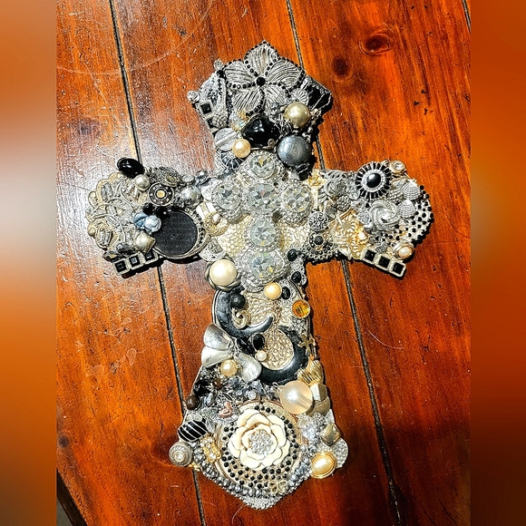 This is beautiful gold, silver, black, cream, and diamond rhinestone cross. It is a one-of-a-kind design.