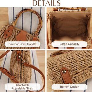 Unique Design: Woven straw square crossbody bag suitable for an everyday bag; pu leather, sturdy bamboo joint top handle, magnetic snap and bottom rivet detailing gives the bag a chic style