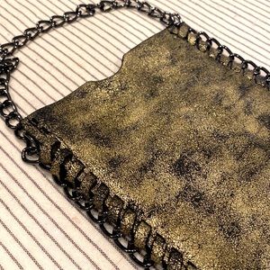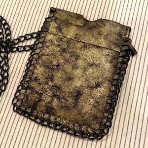 Brand new, never used super soft leather gold and black style purse. Cross body. Black metal strap. Soft black cloth interior. Metallic color.