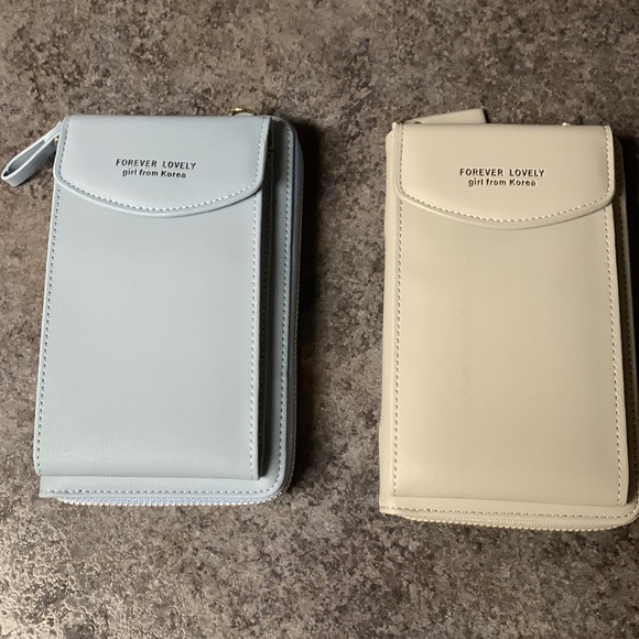 Cross body wallet/purse 1 gray 1 blue. Holds phone perfectly on the outside of purse. Inside has 2 compartments(both holds credit cards) and a zippered middle section for change.