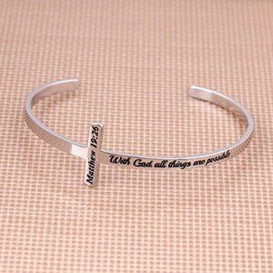 Features: Dainty cuff bracelet engraved with "With God All Things Are Possible," perfect for everyday wear or special religious occasions. The flexible open cuff adjusts easily for a comfortable fit, lightweight, and smooth-edged to prevent scratching. A meaningful gift for women, friends, daughters, or yourself.