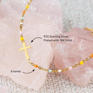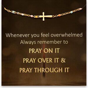 Features: Elegant cross charm bracelet crafted from solid S925 sterling silver plated with 18K gold, featuring a beaded chain. The heartfelt message card says, "Whenever you feel overwhelmed, always remember to pray on it pray over it pray through it." Perfect for everyday wear or as a thoughtful gift.