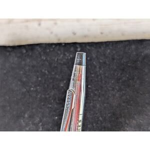 Used. Pen has the name "Hughes" personalized on the side. Silvertone polished metal finish. Blue ink. Works.