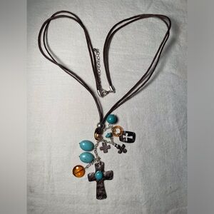 This cross charm like necklace features silver tone crosses with turquoise and amber colored beads. All on a double brown cord with lobster claw closure. Charms measure 4”. Necklace measures 14” with another 2” with extender. Never worn. NWOT.