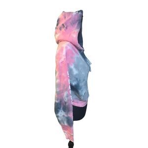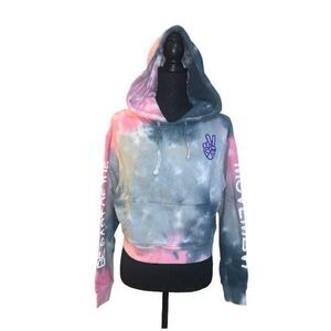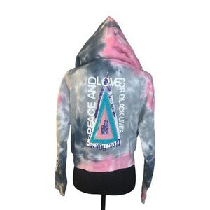 Pink and grey tie dye cropped hoodie. A peacemaking logo details the chest. “Peace and love for black lies. Can you dig it” on back. “Be Part Of The Movement” on sleeves. Long sleeves. Drawstring hood. Kangaroo pocket. 80% cotton, 20% polyester. Size: small. Original price: $88.00. NWT.