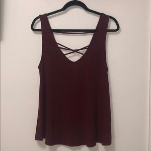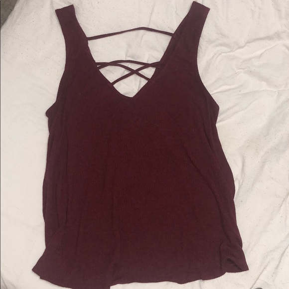 Burgundy ribbed tank w/ v neck line and criss cross front detailing. V neck back w single cross cross. Purchased from Nordstrom Rack, worn about 3 times. No holes/tears, in perfect condition! Fits TTS. Selling because I lost weight and the top no longer fits. Super cute for summer!
