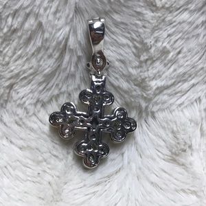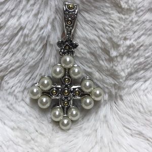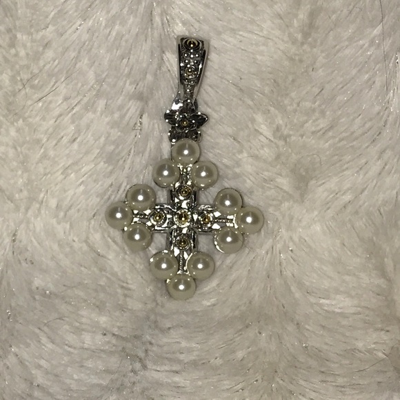 Silvertone and pearl cross enhancer. Enhancer measures 2 inches in length including the bail. 1 inch measurement in width.