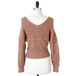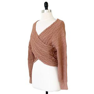 A soft stretchy mixed cable knit sweater with ribbed knit along the bottom portion ad fitted sleeve cuffs. Features cross-front style along the bust and v-neck in back. Can be worn slightly off the shoulder. Pair it with a high-waist skirt or denim or as a layering piece over a dress.