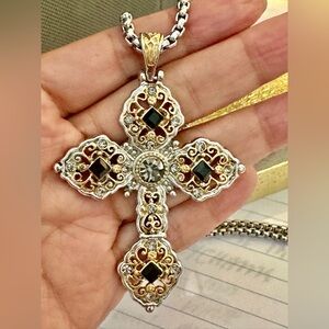 Cross 16” Pendant With 2” extender. Silvertone. Approx: L2 1/2”xW2”. Cross has 2 tone (white and gold). Cross has dark colored stones and surrounded by little clear stones that adds sparkles. The chain is heavy with lobster claws and it has 2” extender. I bought 2 this and gifted the other one. I never get the chance to wear this. Good quality. Please zoom in for more details.