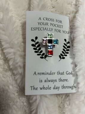 A multicolored small pin with religious saying.