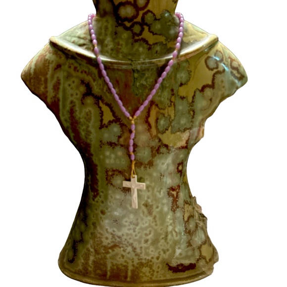 Cross necklace, plastic material, purple and white, excellent condition