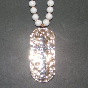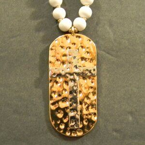 Cross necklace in a contemporary style. Gold silver cross pendant with white and gold bead strand. Brand new. Pendant is approx 2.5 inches and beaded chain is approx 25 inches with 3 inch extender. Perfect accessory for Easter. Nickel free.