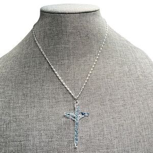 Cross Necklace Dangle Earring Set Vintage Art Glass Clear Blue Religious
