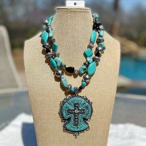 Cross Necklace Multi Strand Statement Set Huge Turquoise Howlite Handmade