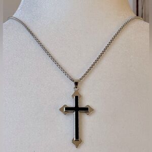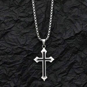 This is a unisex cross necklace. Perfect for men and women. It’s black and silver. It’s made of zinc alloy and iron.