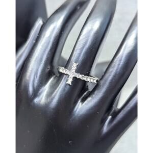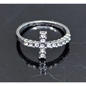 Cross Ring, Silver-tone, Rhinestones, Sideways Cross, Size 6