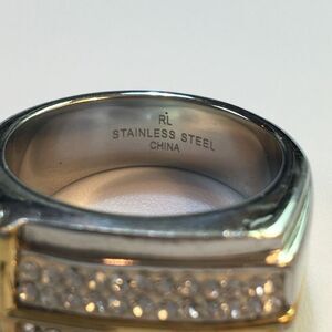 This Christian ring features a gold-plated cross with 60 sparkling cubic zirconia gemstones. The ring is made of high-quality stainless steel with a silver tone finish and has a US ring size of about 10.5. The ring is signed, stamped with the maker's mark RL. It falls under the categories of Rings, Fashion Jewelry, and Jewelry & Watches. The ring has a unique shape with an inspirational and religious theme. The main stones are colorless, giving it a timeless and classic look. The ring is also multicolored silver-toned and gold-colored metal adding to its beauty. It is in fair condition with a chipped stone.
