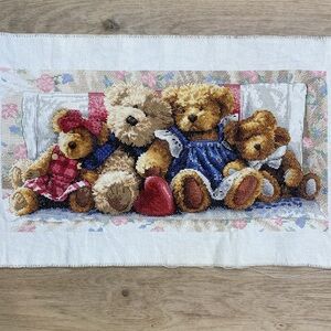 Beautiful rare row of teddy bears completed cross stitch art. Large quality hand embroidered, needlepoint, embroidery art. New unused and in excellent condition.