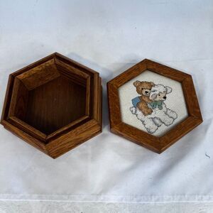 Cross Stitch Bear & Lamb Wood Hexagonal Trinket Jewelry Keepsake Box