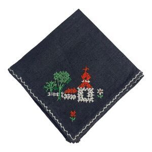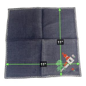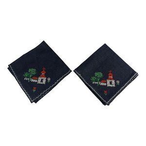 This is a set of two handmade cloth napkins featuring a cross stitch design of a chapel in the corner. The napkins are blue in color and measure 11 inches. The set is part of a collection of kitchen linens and textiles, and is a vintage item.