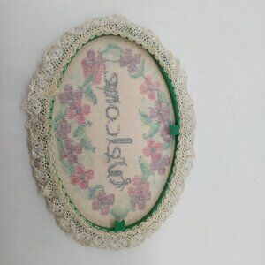 Cross Stitch Embroidery Welcome Sign 6x8 Oval Green Plastic Frame Lace Border