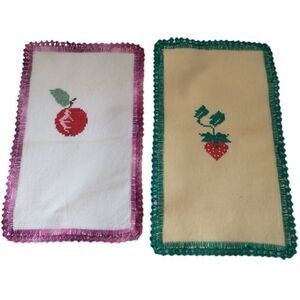 Cross Stitched Fruit Doily Set 2 Tea Towels Linens Handmade Vtg Farmhouse Country. Condition is pre-owned and vintage. Cute set of 2 totally hand stitched including the edges... MULTIPLE USES. Crafts, linens, for framing etc.