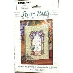 Dimensions Stone Path Studio “The Good Life” La Dolce Vita Counted Cross Stitch Kit #72837! Old World Look. A Unique Wrapped Fabric Finish As Used In An Artists Studio. 5X7 (13x18cm) NWT. We Opened To Make Sure Contents Were Inside! Needs to be stitched...not the finished item.