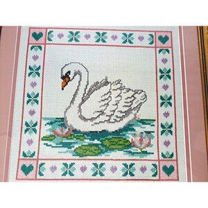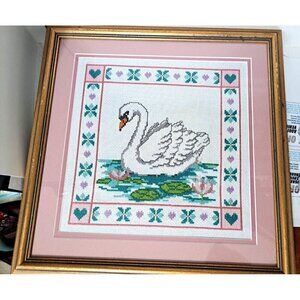 Cross Stitch Swan & Waterlilies Pink Mat Gold Tone Professionally Framed