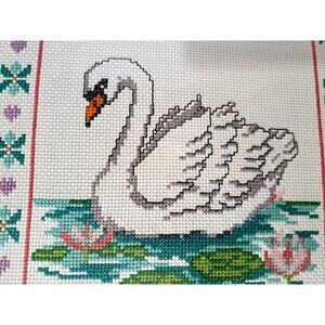 Lovely cross stitch framed picture of a swan on the water. Frame is 18 x 18, and has a glass front.