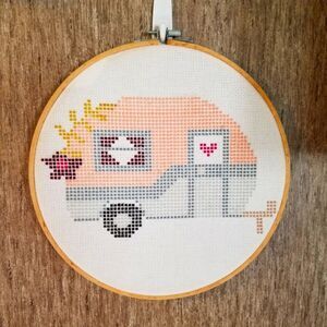 Cross stitched vintage camper. Pink and gray on a white background. 12 inch.