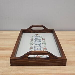Cross Stitch "Welcome" Handmade Wooden Serving Tray 16x11 Shabby Cottagecore