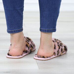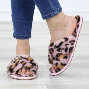 Cross Strap Leopard Blush Pink Puff Fuzzy Fluffy Slip On Plush Slippers
