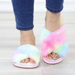 Cross Strap Tie Dye Multi Color Puff Fuzzy Furry Fluffy Slip On Plush Slippers
