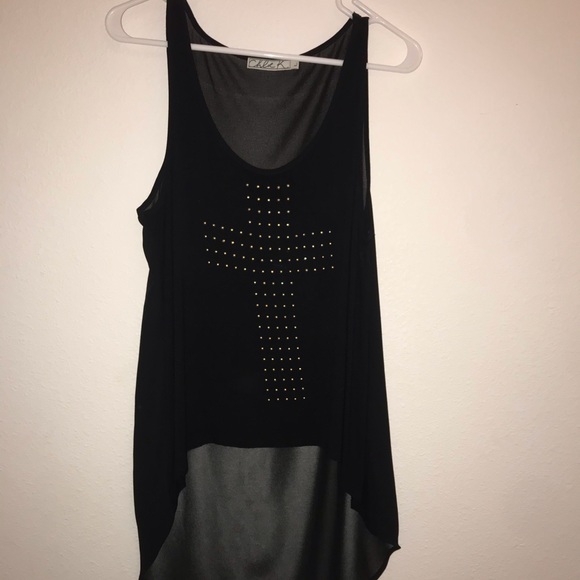 Size: large Color: black Black tanktop with gold cross, shorter in the front, longer in the back, sheer back. Lightly worn