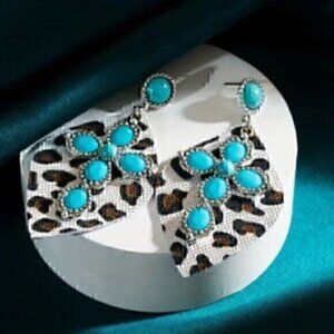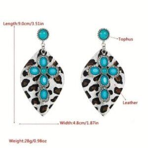 Cross With Turquoise Shiny Rhinestone Decor Leopard Earrings Retro Bohemian