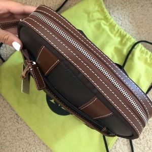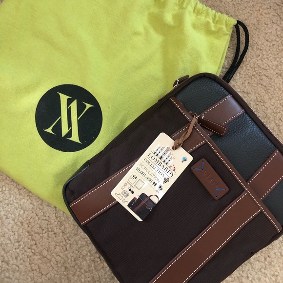 Italian leather cross bag with blue and white stripe interior