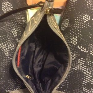In good shape , has two main pocket areas and one smaller pocket area inside. It has a small dark spot on the front but it's barely visible.