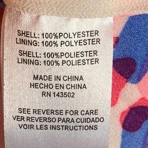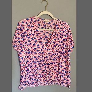 White, pink, and blue blouse that crosses across the front and banded at bottom. Rolled sleeves