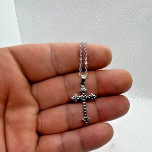 Cross necklace pendant with lab simulated diamond accents. Cross size 35mm by 25mm . Chain 16” plus 2” extension total 18” with lobster lock closure. 925 sterling silver plated. Custom made for our loyal customers. Looks 1000 times better in reality than photos. Mb1000