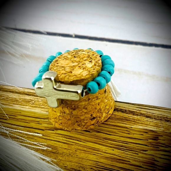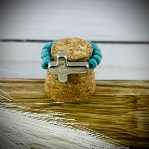 Cross stretch statement ring with turquoise bead band