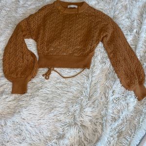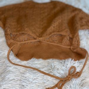 See through sweater can be worn with or without a undershirt . Tie in the back . Great quality .