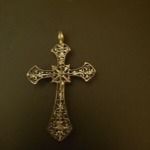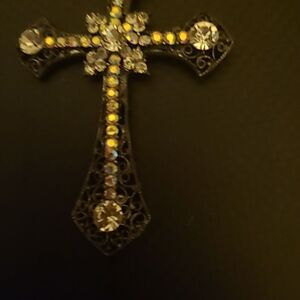 Pre-owned in good condition. The medallion is approximately 2.5 inches long and is not missing any stones. No chain with it.