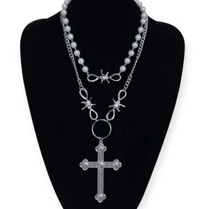 Multi layering Pearl choker and barb wired cross necklace set!