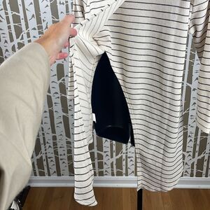 Embellish Longline Cross-Over Split Back Striped Thermal Top size M. Features cotton polyester blend thermal fabric in cream with black stripes, long sleeves, longline fit, crossover split back. Perfect to pair with leggings or skinny jeans and tall boots! Appears new without tags and no flaws to note.