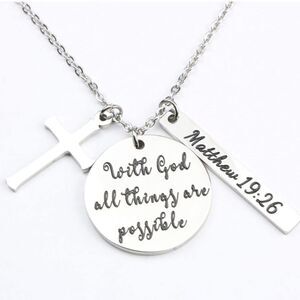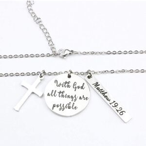 Engraved Bible Verse Necklace. “With God all things are possible” Mathew 19:26. Charm with Cross High quality polished 316L stainless steel. Will never turn black, fade, rust or tarnish. Length is 18” plus 2” extender Comes with jewelry storage pouch. If this is a special gift for someone, please let me know and I will package necklace in a beautiful box😊