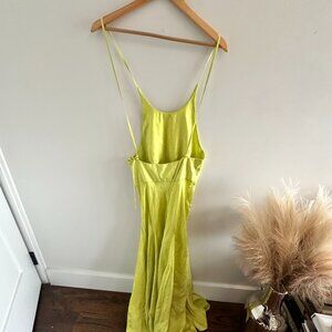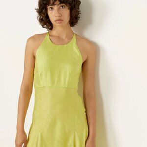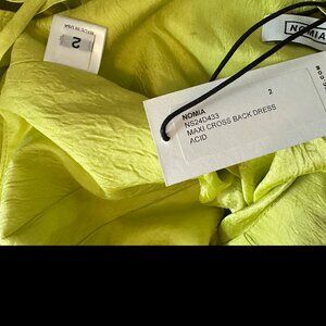 Brand New With Tags. Scoopneck Bias maxi dress with spaghetti straps that tie in back. Six insets in skirt for added volume. Cut in a neon yellow lightweight crinkle finished acetate. Size 2. See Product Page below